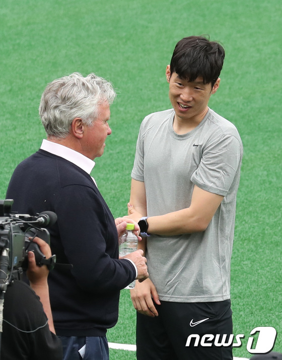 5일 서울월드컵경기장 보조구장에서 열린 2022 한일월드컵 20주년 기념 '2002 월드컵 레전드 올스타전'에서 히딩크 전 감독(왼쪽)이 박지성과 대화를 나누고 있다. /사진=뉴스1