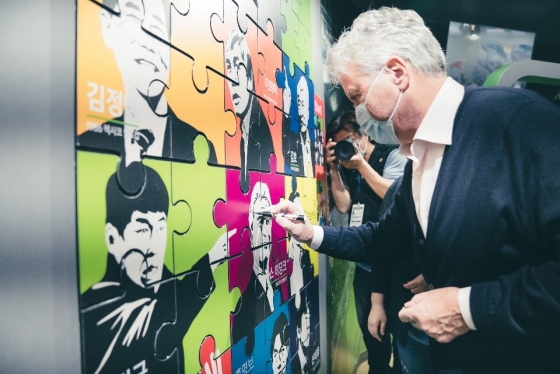 대한축구협회 축구사랑나눔재단과 함께하는 고 유상철 감독 1주기 추모 전시 존에서는 조병득 재단 이사장과 함께 고(故) 유상철 선수가 한일전에 입고 뛰다 찢어진 유니폼과 그에 영감을 받은 작품 앞에서 잠시 회상에 잠기며 고인을 추모했다.