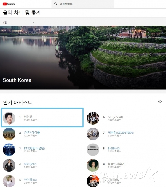 가수 임영웅이 유튜브 뮤직 최근 7일 조회수 1위를 기록하며 최고 대세 존재감을 빛냈다.