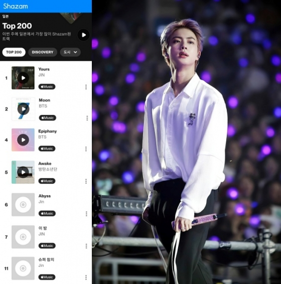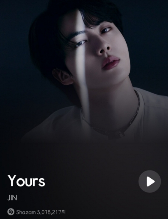 방탄소년단(BTS) 진의 'Yours'가 세계 최대 음원 검색 플랫폼 샤잠(Shazam)에서 한국 OST 최초로 500만 샤잠을 돌파하며 존재감을 빛냈다.