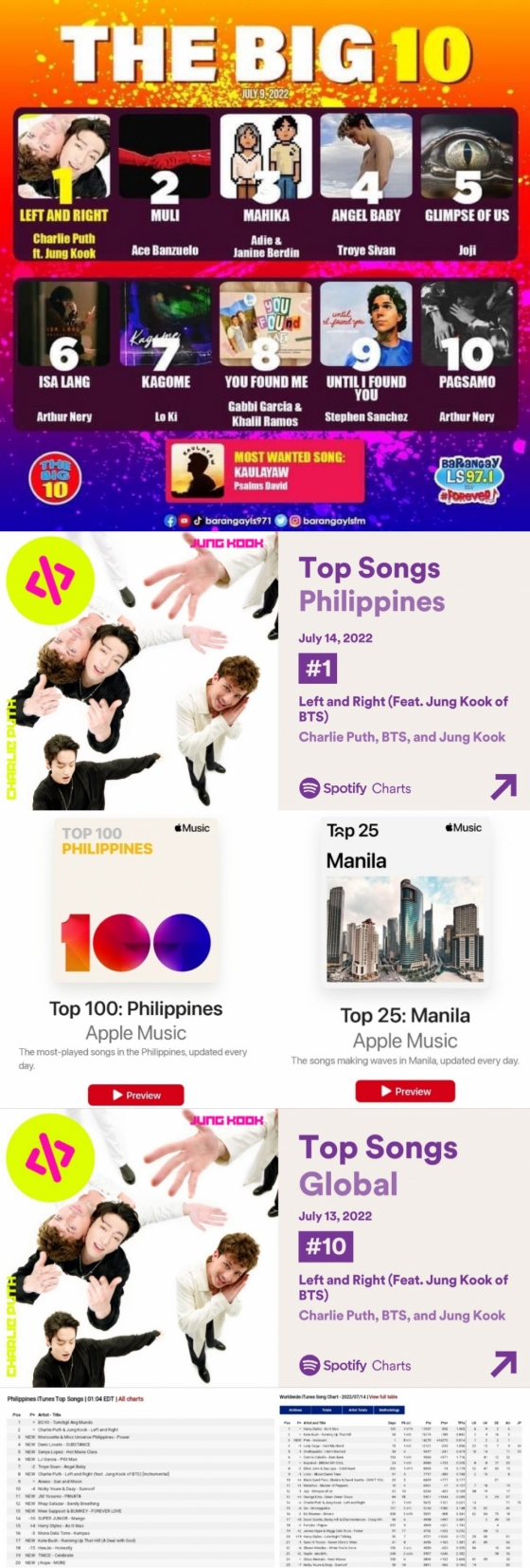 정국과 찰리 푸스가 발매한 협업곡 '레프트 앤드 라이트'(Left and Right)는 최근 필리핀 바랑가이 LS FM 97.1 라디오의 빅10 차트에서 1위를 차지했다.