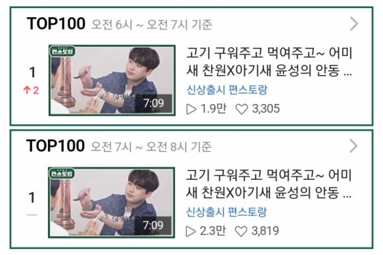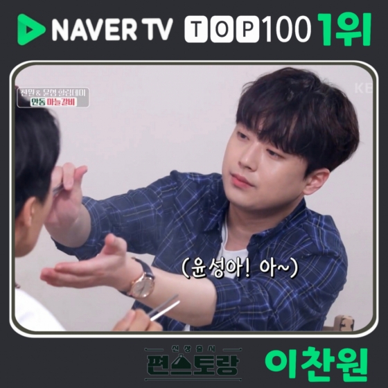 7월 29일 KBS 2TV '신상출시 편스토랑' 네이버TV 채널에 공개된 '고기 구워주고 먹여주고~ 어미새 찬원X아기새 윤성의 안동 마늘갈비 먹방' 영상은 7월 30일 오전 6시~오전 8시 기준 네이버TV 톱100 1위를 차지했다.