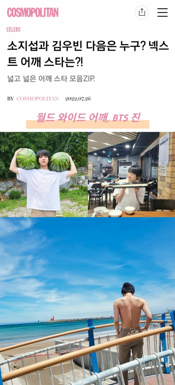 패션 매거진 코스모폴리탄(COSMOPOLITAN)은 최근 '소지섭과 김우빈 다음은 누구? 넥스트 어깨 스타는?'라는 기사에서 '월드 와이드 어깨, BTS 진'이라는 타이틀로 진의 어깨를 집중 조명했다.