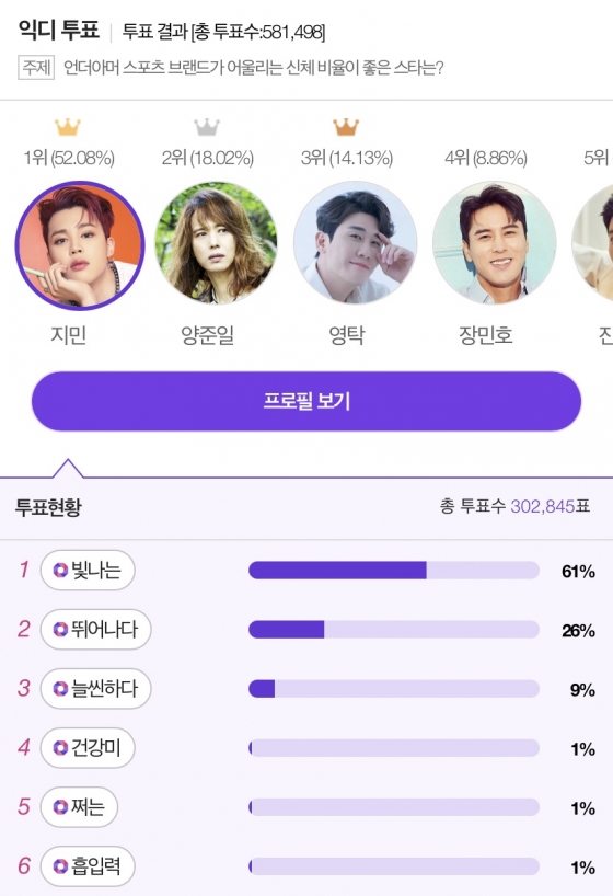 방탄소년단(BTS) 지민이 '언더아머 스포츠 브랜드가 어울리는 신체 비율이 좋은 스타' 1위에 오르며 스포츠룩 투표 1위를 싹쓸이했다.