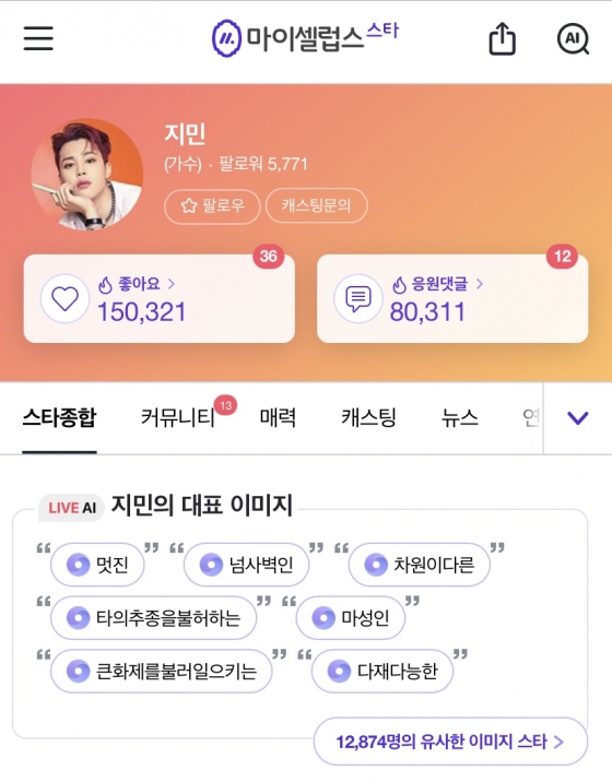 대표 이미지로는 '멋진', '넘사벽인', '차원이 다른', '타의 추종을 불허하는', '마성인', '큰화제를 불러일으키는', '다재다능한' 등으로 나타났다.