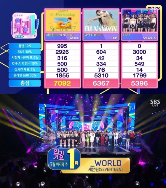 31일 방송된 SBS '인기가요'에서는 세븐틴의 '_WORLD'가 나연의 'POP!', 있지의 'SNEAKERS'를 누르고 1위를 차지햇다.