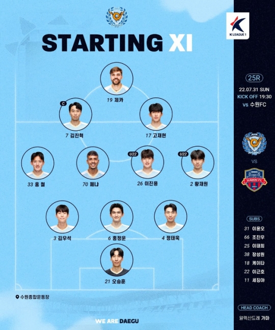 수원FC와 대구는 31일 오후 7시 30분 수원종합운동장에서 열리는 하나원큐 K리그1 2022 25라운드에서 격돌한다.