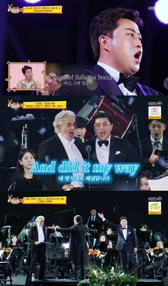 솔로곡을 마친 김호중을 향해 열렬한 환호가 쏟아진 가운데, 김호중은 플라시도 도밍고와 듀엣 무대까지 선보였다. 거장 플라시도 도밍고와 함께 무대에 오른 김호중은 눈물을 글썽이며 감격해했다.