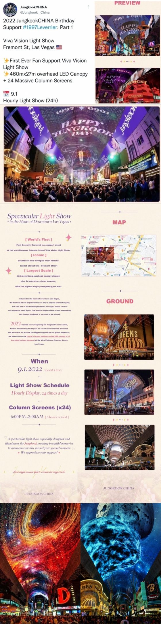 정국의 중국 팬클럽 '정국 차이나'는 미국 라스베이거스 프리몬트 스트리트에서 정국의 생일을 위한 라이트 쇼를 진행한다.