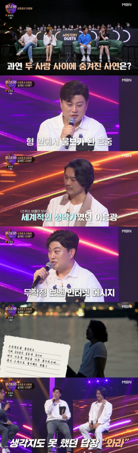 '미스터리 듀엣'에서 가수 김호중이 평소 팬이던 오페라 가수 이응광에게 메시지를 보내 친해지게 됐다고 밝혔다.