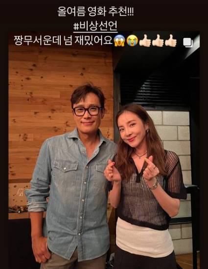 산다라박은 8일 인스타그램에 "이병헌 선배님과 함께 한 비상선언 프라이빗 시사회~!!!"라는 글과 함께 사진을 올렸다.