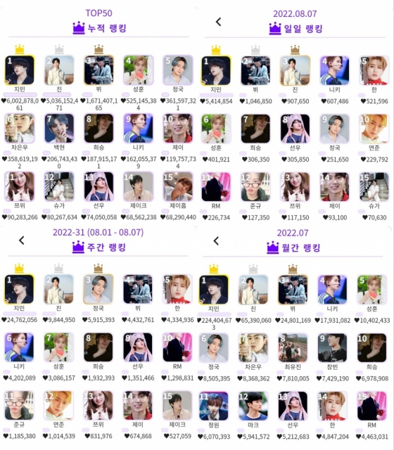 지민은 주간 기록에서도 8월 첫째주 (2022. 8. 1 ~ 2022. 8. 7) 2476만 2056표로 주간 랭킹 1위에 올랐다.