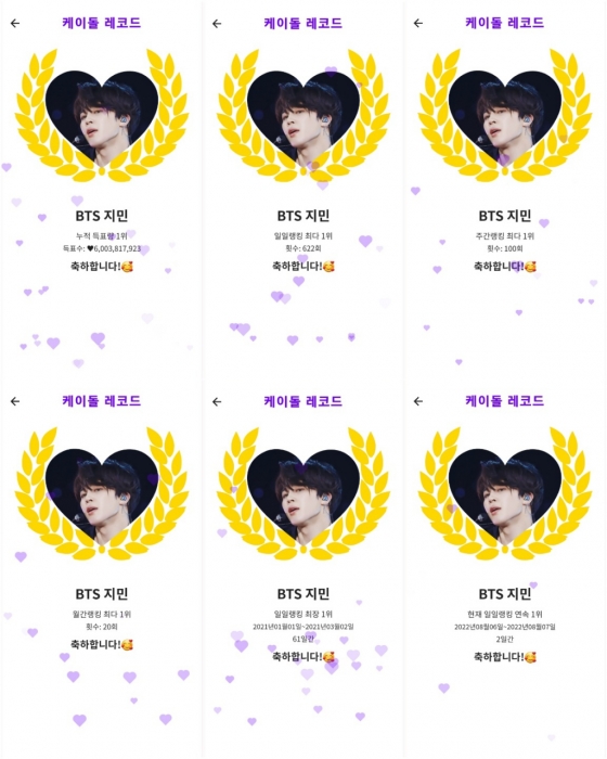 지민은 글로벌 팬 대상 K팝 인기투표 사이트 케이돌(KDOL)에서 8월 7일 541만 4854개의 하트를 받아 전체 1위에 올랐다. 지민은 622회째 일일 랭킹 최다 1위 신기록을 다시 썼다.