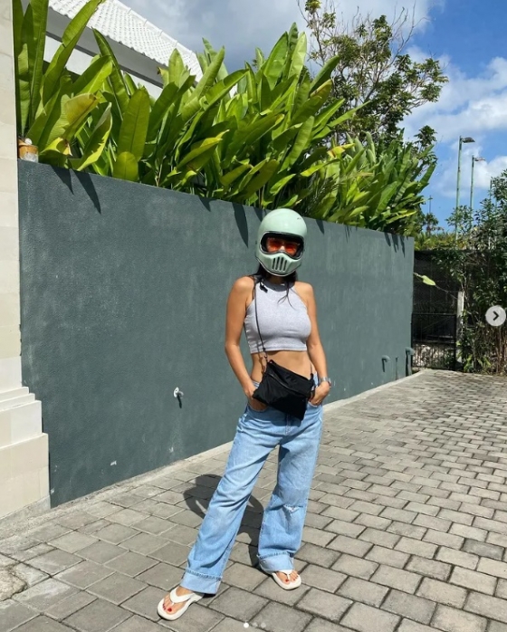 가슴 바로 아래까지 내려오는 슬리브리스 크롭티는 볼륨감 넘치는 가희의 몸매를 부각시키고 있다. 가방으로 살짝 가린 복근과 구릿빛 피부가 인상적이다. 여기에 머리에는 헬맷을 쓰고 있어 눈길을 끈다.
