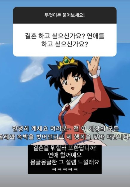 이어 전다빈은 자신의 키가 165cm이고 몸무게는 55kg이라고 적었으며 "결혼을 뭐하러 또 한답니까? 연애할 거예요. 몽글몽글한 그 설렘 느낄래요"라고 적었다.