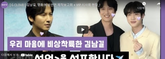 김남길 소속사 길스토리이엔티(GILSTORYENT)는 12일 공식 유튜브 채널을 통해 '[ G.CLOUD ] 김남길, 영화 비상선언 제작보고회 + VIP 시사회 현장_!'을 공개, 진과 김남길의 압도적인 비주얼 투샷을 공개했다.