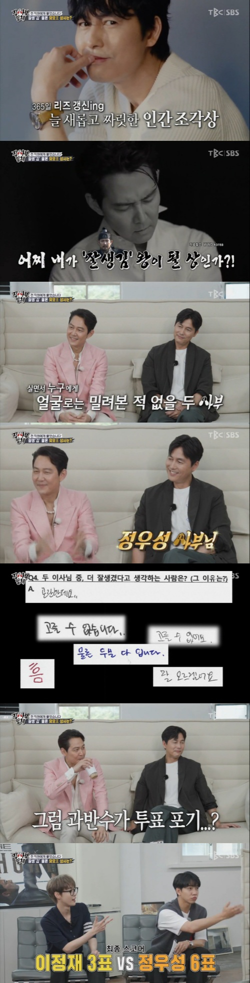투표 결과 압도적인 투표수로 이번에는 이정재가 호명됐다. 이정재는 주먹을 불끈 쥐고 기쁨을 만끽했다. 비로소 편안해진 모습으로 여유를 즐기는 모습에 정우성은 "패배를 겸허히 받아들이겠다. 잘생긴게 최고"라고 말했다. 그러자 이정재는 "아니 이긴 것 같지가 않은데?"라고 말해 좌중을 폭소케했다.