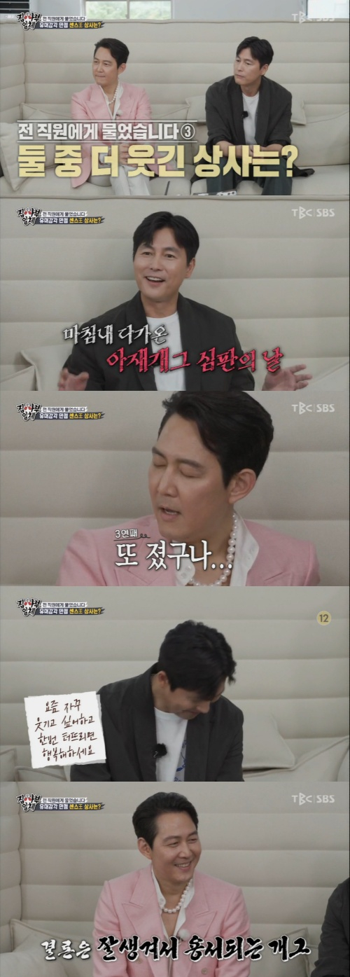 이어진 세번째 질문인 '둘 중 더 웃긴 상사는?'에 정우성의 이름이 호명되었다. 얼굴왕 상사, 체력왕 상사와 센스 왕 상사까지 3연패한 이정재는 눈을 질끈 감으며 한숨을 내쉬어 웃음을 자아냈다.