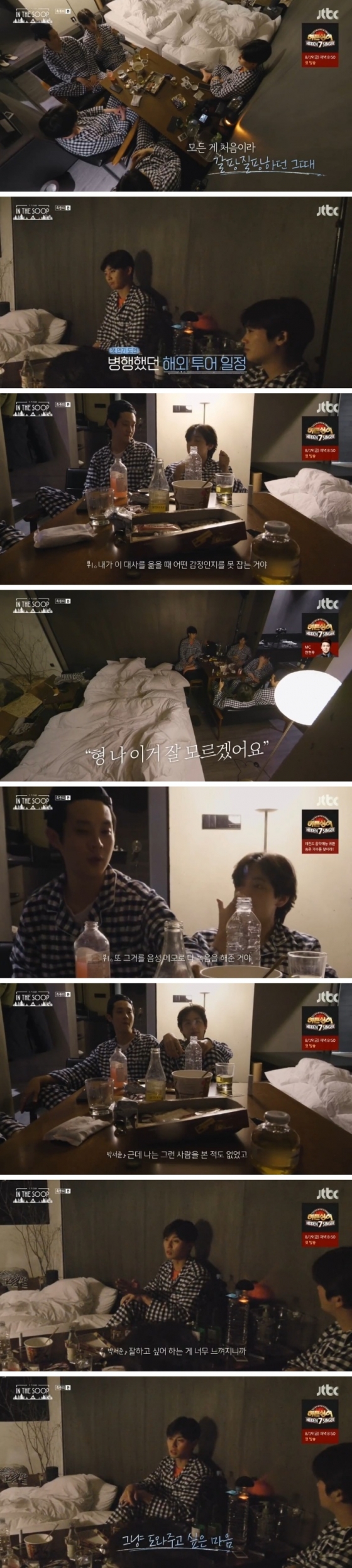 뷔는 드라마 '화랑' 촬영 당시, 박서준에게 도움을 받았던 기억을 떠올렸다. 뷔는 "연기가 처음인데도 불구하고 콘서트 투어랑 병행했다. 대사를 읊을 때 어떤 감정을 잡아야 할지 못 잡았다. 처음이니까. 그래서 형(박서준)한테 '잘하고 싶은데 이거 잘 모르겠어요'라고 솔직하게 얘기했다. 그랬더니 형이 하나하나 다 잡아주면서 얘기해주고, 그걸 또 음성메모로 녹음해준 거다"라고 말해 놀라움을 안겼다.