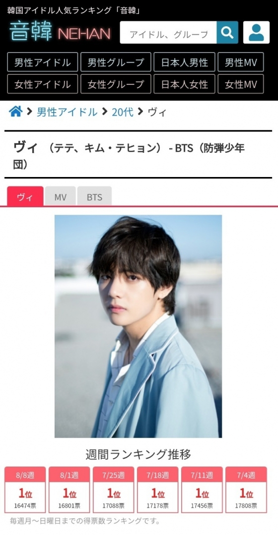 뷔는 지난 8월 8일부터 14일까지 일본 인기 아이돌 랭킹 사이트 '네한(音韓)'에서 진행된 'K팝 남자 아이돌 랭킹' 투표에서 1만 6474표를 획득, 71주 연속 1위를 차지해 독보적인 인기를 입증했다.