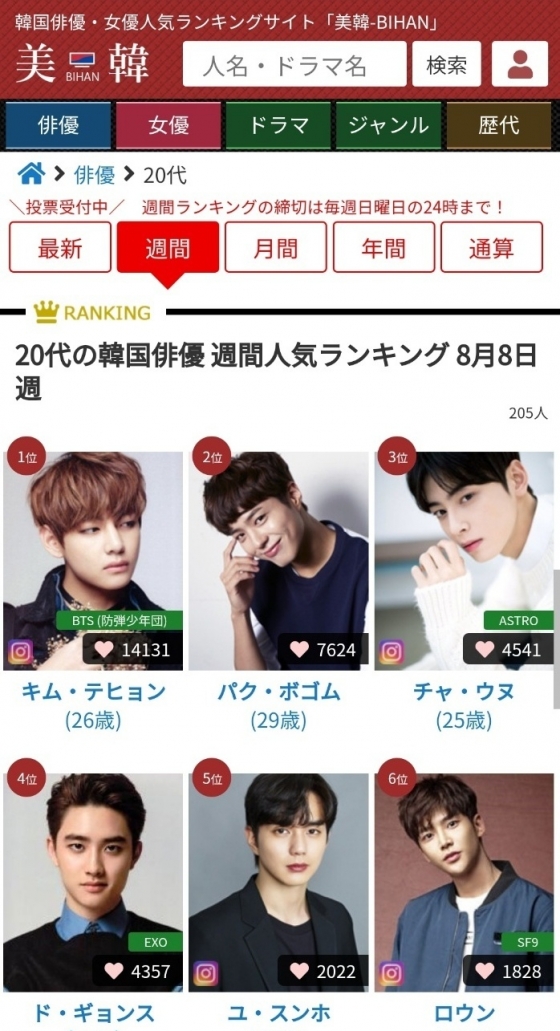 또 같은 주간 K드라마, 영화, 배우에 관한 전문미디어인 '비한(美韓)'에서 진행한 '20대 한국 배우' 부문 투표에서도 1만 4131표를 획득, 68주 연속 1위를 차지했다.