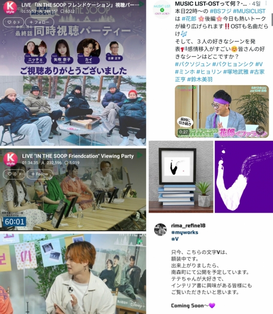 이런 인기에 힘입어 디즈니+재팬은 '인더숲 : 우정여행' 마지막 편을 LINE LIVE에서 동시 시청 파티를 개최했다. 일본 유명MC가 진행하는 특별 라이브 방송에 함께 출연한 일본 보이그룹 초특급의 인기 멤버 오가사와라 카이는 "원래 BTS를 좋아하는데 그중에서도 뷔. 태태를 제일 좋아하기 때문에 인더숲을 안 볼 이유가 없었어요"라고 팬심을 고백했다.
