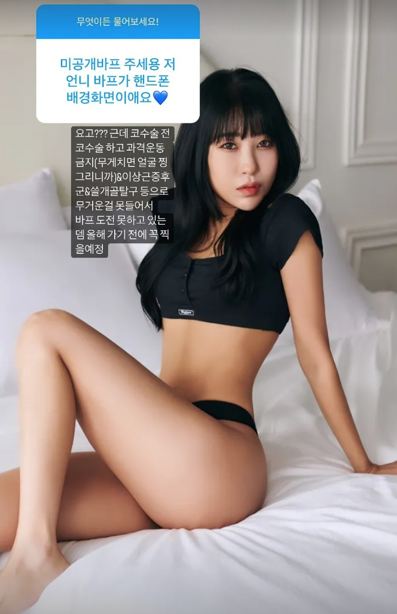 이세영은 사진에 대해 "코수술하고 과격 운동 금지(무게치면 얼굴 찡그리니까) 이상근중후군, 쓸개골탈구 등으로 무거운걸 못 들어서 바프 도전 못하고 있는뎀 올해 가기 전에 꼭 찍을 예정"이라고 적었다.