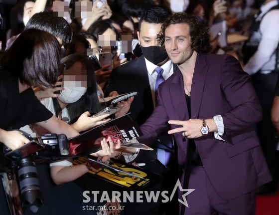 할리우드 배우 애런 테일러 존슨이 19일 오후 서울 용산구 아이파크몰 CGV에서 열린 영화 '불릿 트레인' 레드카펫 행사에서 팬들과 즐거운 시간을 보내고 있다.