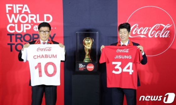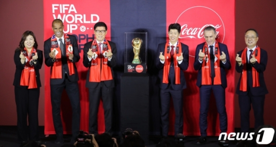 월드컵 스폰서 코카콜라는 24일 오후 2시 서울 여의도 더 현대 서울 사운드 포레스트에서 FIFA 월드컵 카타르 2022 트로피 투어 행사를 열고 우승 트로피를 공개했다.