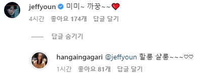 남편 연정훈은 "미미~ 까꿍~~♡"이라는 댓글로 축하했고 한가인은 "할룽 샬룽~~~♡♡"이라고 답하며 부부 간에 남다른 케미를 자랑했다.