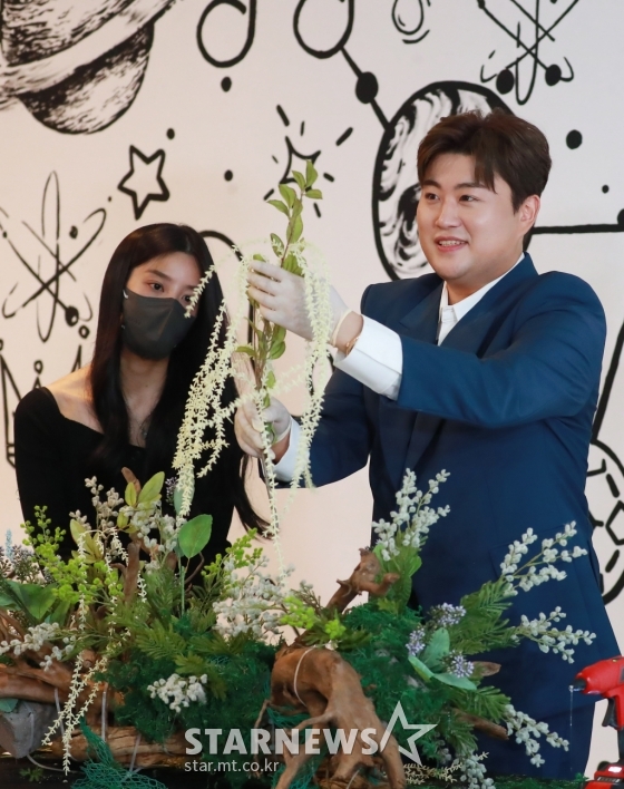 가수 김호중이 16일 오후 서울 성동구 성수동 갤러리아포레 더 서울라이티움에서 열린 2022 김호중 展 '별의 노래' 오픈 행사에서 꽃꽂이를 하고 있다.