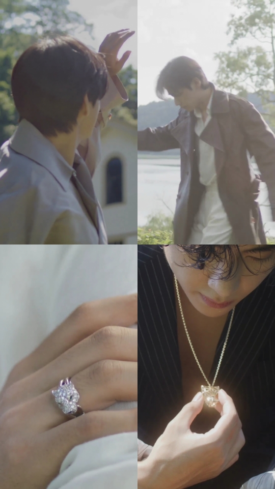 뷔는 단정하고 길게 뻗은 손가락에 팬더 드 까르띠에 링을 착용해 고급스러우면서도 자유분방한 매력을 유감없이 뽐냈다.