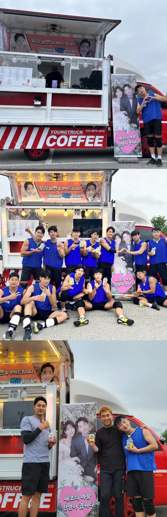 사진 속엔 한영이 박군을 응원하기 위해 보낸 커피차의 모습이 담겨있다. 현수막엔 "우리 남편 잘 부탁드립니다. 경찰 사나이 박군 화이팅"이라며 응원의 문구가 적혀있다.