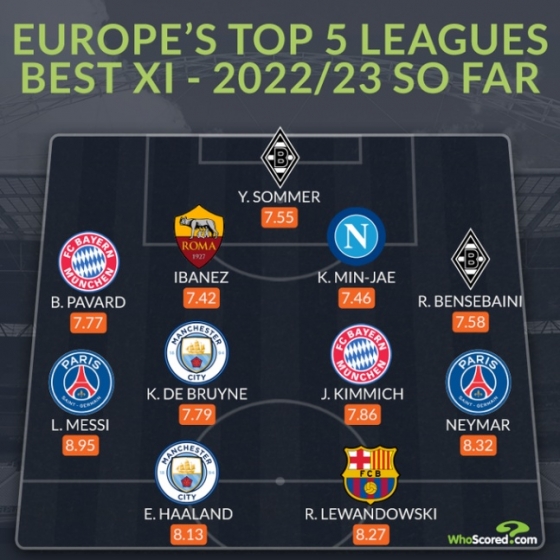 후스코어드닷컴 선정 현재까지 2022~2023시즌 유럽 베스트 11./사진=후스코어드닷컴 공식 SNS 갈무리