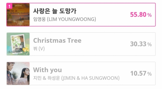 임영웅의 '사랑은 늘 도망가'는 55.80%의 압도적 득표율로 1위를 기록했다.