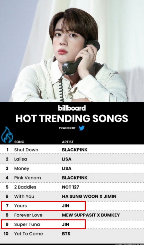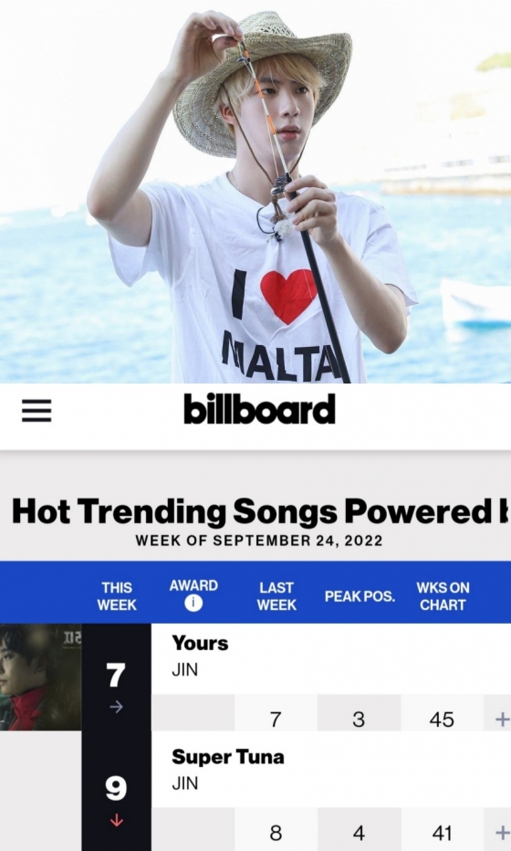 진의 솔로곡 'Yours'와 '슈퍼 참치'는 지난 9월 21일 빌보드 차트가 발표한 '핫 트렌딩 송즈 주간 차트' (Billboard Hot Trending Songs Chart-weekly/9월 24일 자)에서 각각 7위와 9위에 올랐다.