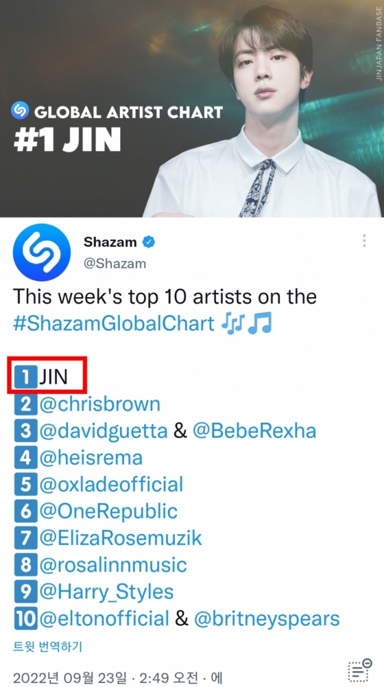방탄소년단(BTS) 진이 세계 최대 음원 검색 플랫폼 샤잠(Shazam)에서 최초·최장·최다 신기록을 또다시 자체 경신하며 최정상 솔로 아티스트로서 독보적 존재감을 빛냈다.