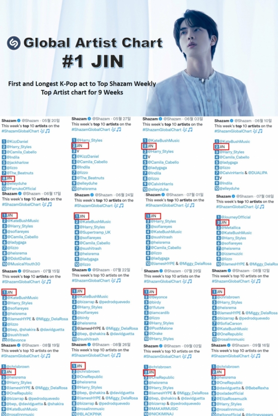 진은 전 세계 최정상 아티스트들이 치열하게 경쟁 중인 '샤잠 글로벌 주간 톱10 아티스트'에 16주의 '톱2', 17주의 '톱10' 차트인을 기록했다. 이 또한 K팝 아티스트 최초이자 최장 차트인이라는 대기록으로, 진은 또다시 신기록을 자체 경신하며 압도적 브랜드 파워를 보여줬다.