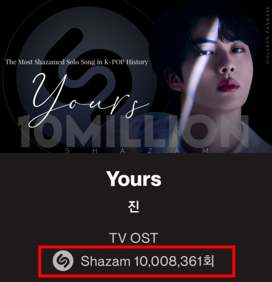 진의 'Yours'는 5월 3일 100만 샤잠을 돌파 후 불과 4개월 만에 1000만 샤잠 돌파하며 역대급 음원 파워를 보여줬다. 특히 'Yours'는 지난 8월 4일 704만 샤잠을 돌파. 진이 활동 중인 그룹 방탄소년단의 'Dynamite'(다이너마이트) 701만 샤잠을 뛰어넘으며, K팝 역사상 가장 많이 샤잠 된 곡이란 신기록을 세웠다.