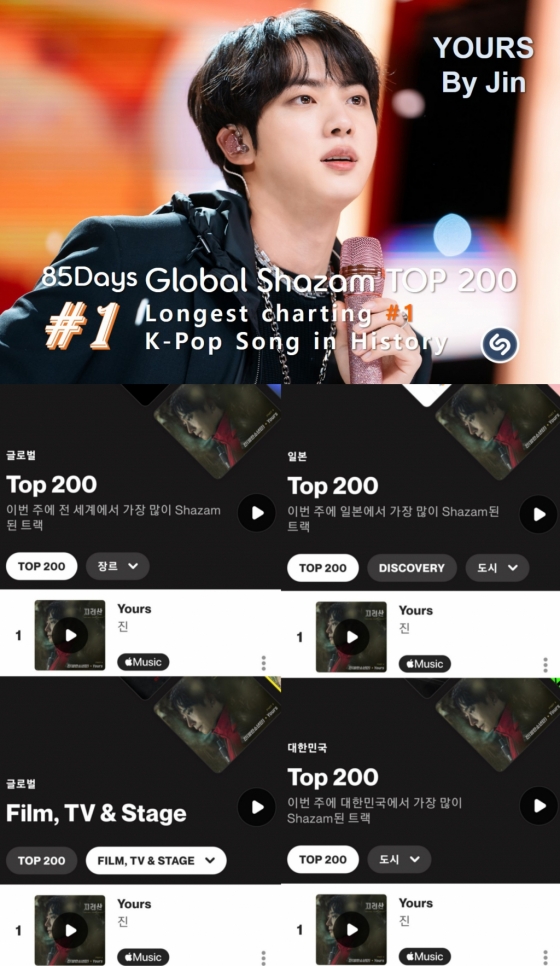 진의 'Yours'는 9월 23일 기준 샤잠 '글로벌 TOP 200' 차트에서도 최정상 1위를 차지하며, K팝 최초이자 최장 1위인 85일 1위의 대기록을 또다시 자체 경신했다. 또한 133일 연속 '톱10'을 기록하며 최정상 솔로 아티스트의 막강한 저력을 보여줬다.