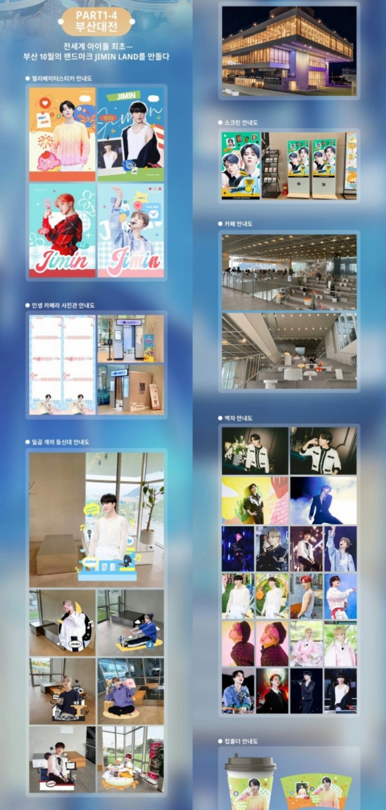 '10월의 부산의 랜드마크 JIMIN LAND'라는 주제로 진행되는 이번 생일 프로젝트는 500제곱미터에 달하는 초대형 커스텀 현수막 7개로 건물 외벽을 둘러싸는 것은 물론, 2층의 전시장 입구와 벽, 3층과 4층 사이의 계단 벽면, 5층의 실내 기둥, 엘리베이터와 에스컬레이터 포스터, 롤업 배너, 펜트하우스까지 지민의 모습이 담긴 스티커가 부착된다.
