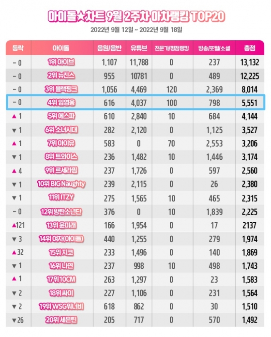 임영웅은 9월 24일 발표된 아이돌차트 9월 2주차(22.9.12~22.9.18) 아차랭킹에서 음원점수 616점, 유튜브 점수 4037점, 전문자/평점랭킹 100점, 소셜점수 798점 등 총점 5551점으로 톱4를 기록했다. 1위는 아이브, 2위는 뉴진스, 3위를 블랙핑크였다.