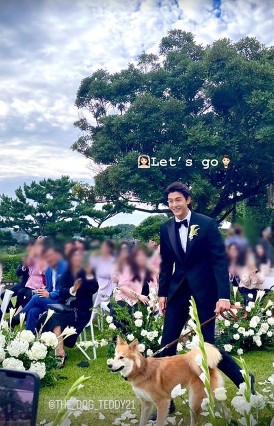공개된 사진에는 단정한 턱시도를 착용한 이기우가 결혼식에 입장하는 모습이 담겼다. 특히 이기우는 반려견인 테디와 함께 동행하고 있어 눈길을 끌었다.