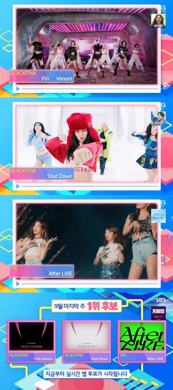 25일 방송된 SBS '인기가요'에는 블랙핑크의 'Pink Venom', 블랙핑크의 'Shut Down', 아이브의 'After Like'가 1위 후보에 올랐다.