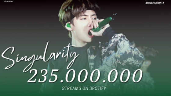 방탄소년단(BTS) 뷔의 솔로곡 'Singularity(싱귤래리티)'가 세계 최대 음원 플랫폼 스포티파이(Spotify)에서 2억 3500만 스트리밍을 돌파하며 인기를 빛냈다.