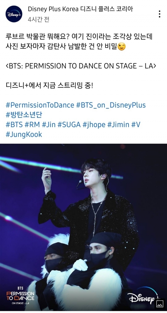 최근 디즈니(Disney)는 공식 트위터를 통해 'BTS PERMISSION TO DANCE ON STAGE - LA '속 진의 사진을 공개했다.