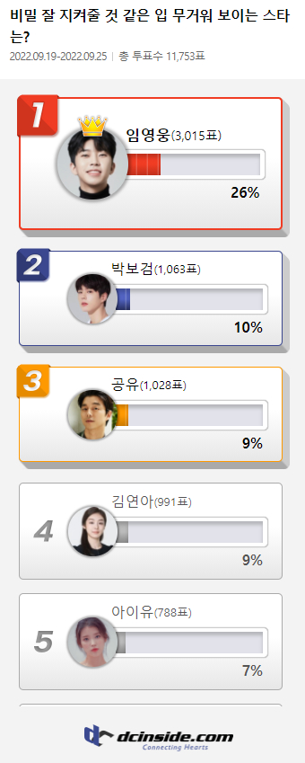 임영웅은 9월 19일부터 9월 25일까지 디시인사이드에서 진행된 '비밀 잘 지켜줄 것 같은 입 무거워 보이는 스타는?' 설문에서 1위에 올랐다.