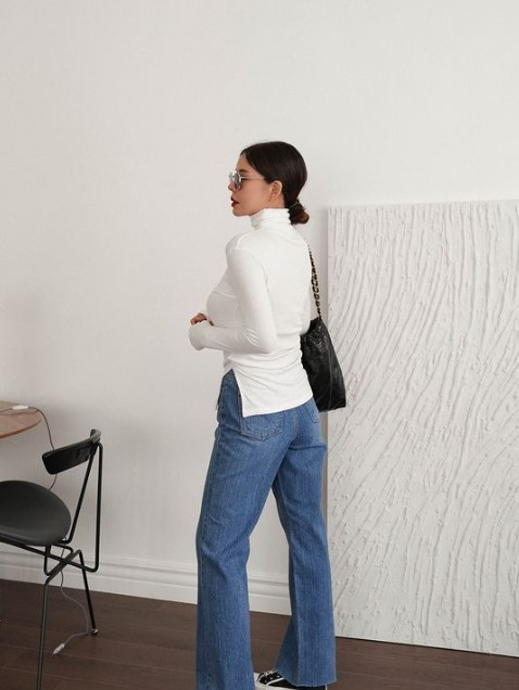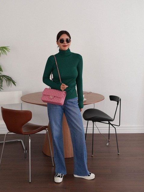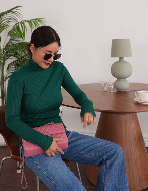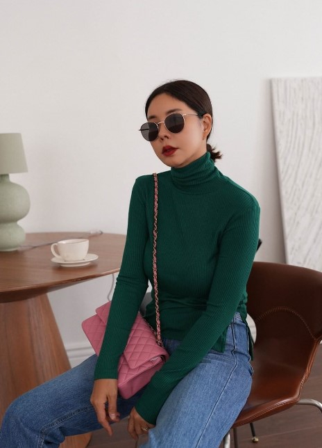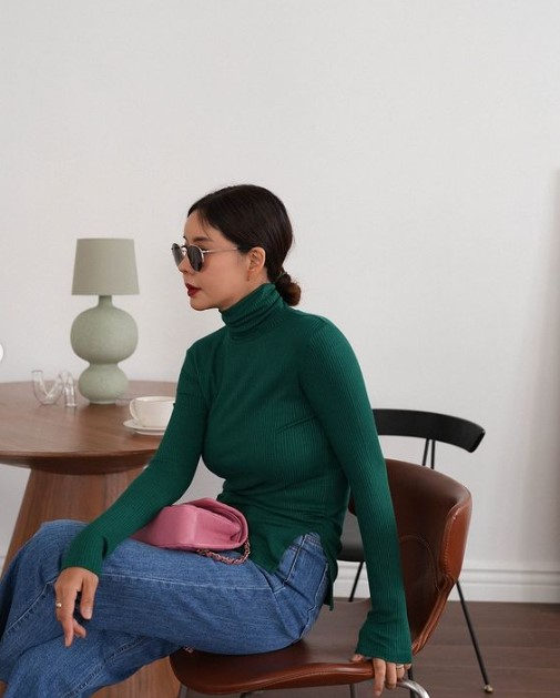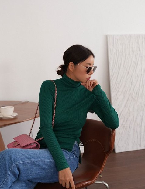 사진에서 김준희는 몸매가 드러나는 그린 컬러 목폴라 티셔츠와 팬츠를 입고 글래머러스한 몸매를 과시하고 있다.