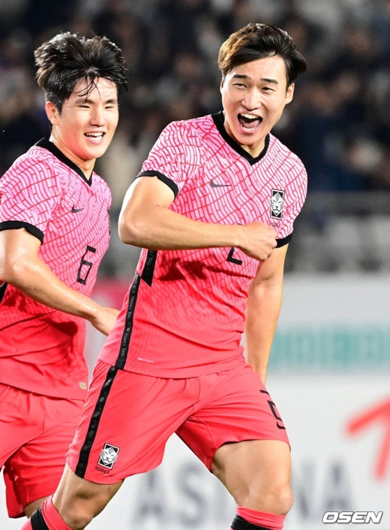 한국 올림픽 축구대표팀 수비수 조현택(등번호 2번) 26일 화성에서 열린 우즈베키스탄전에서 프리킥 골을 넣고 기뻐하고 있다. /사진=OSEN