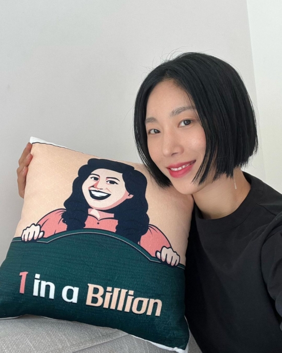 공개된 사진 속에는 '금쪽 상담소' 쿠션을 안고 환하게 웃고 있는 리아킴의 모습이 담겨있다.